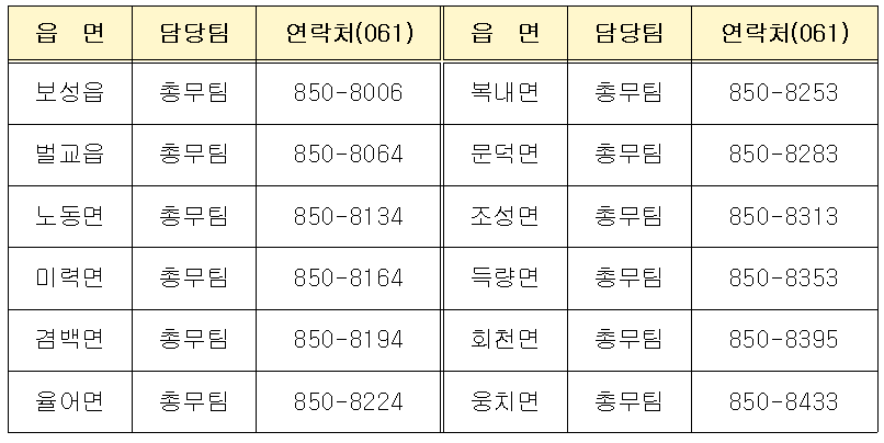 보성사랑지원금과 관련하여 문의할 사항이 있다면 주소지관할 읍/면동사무소 총무팀에 연락하면 됩니다.