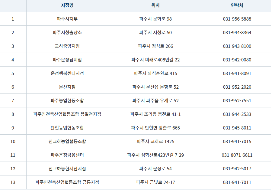 파주페이 카드를 오프라인에서 구매할 수 있는 곳의 리스트입니다. 판매대행점에서 파주페이 카드를 구매 후 현금 충전하여 파주페이 가맹점에서 사용하면 됩니다.